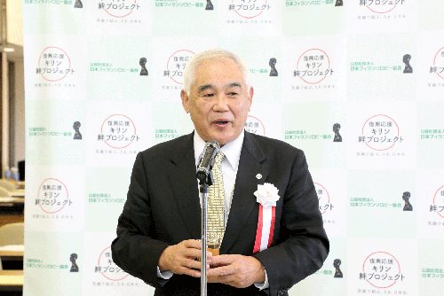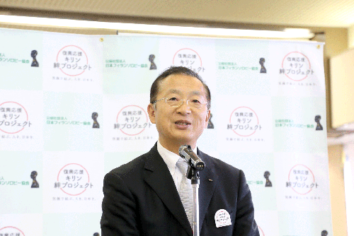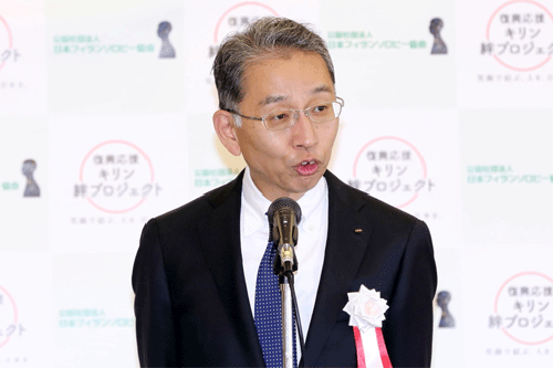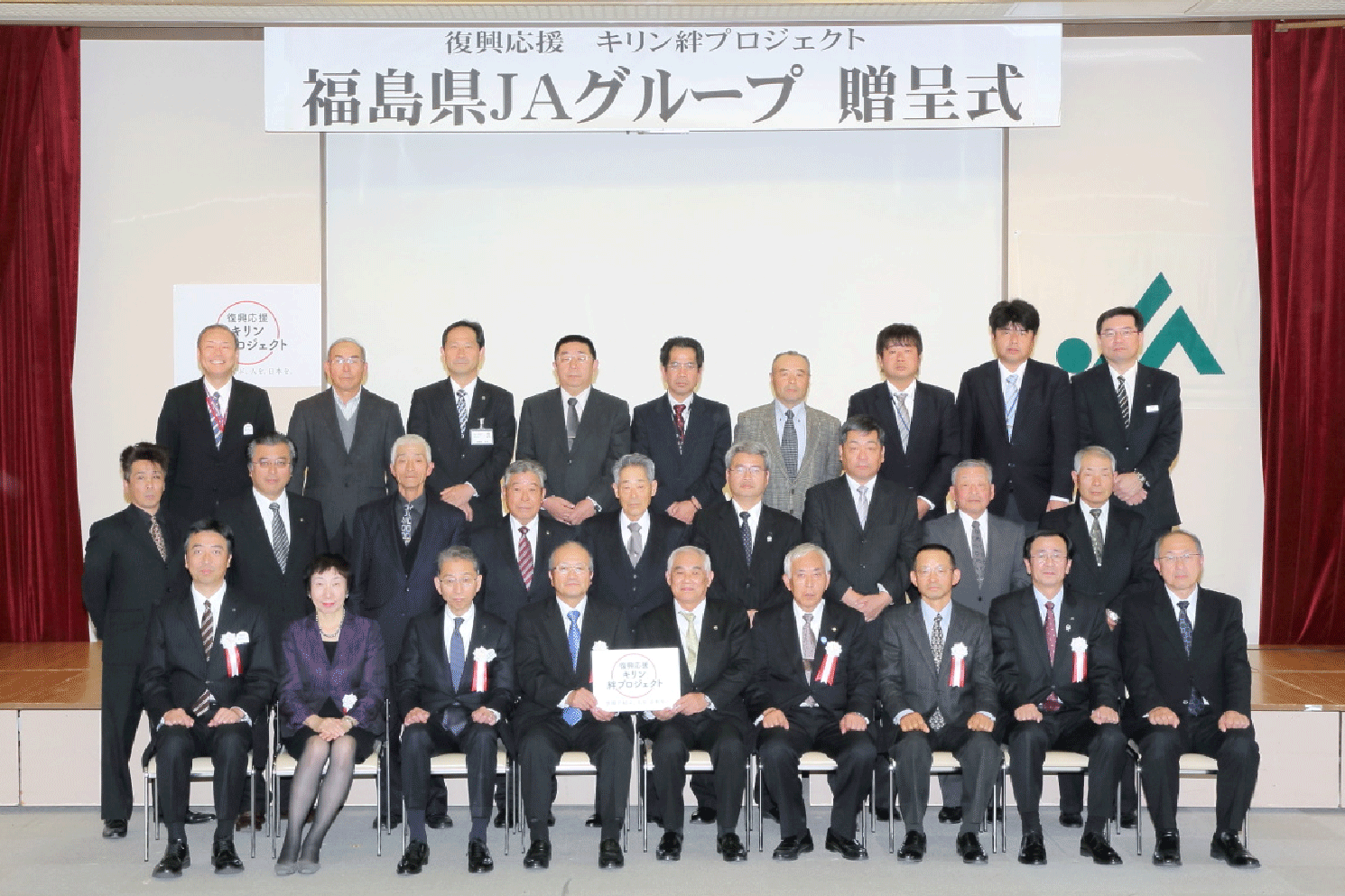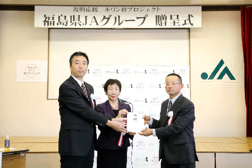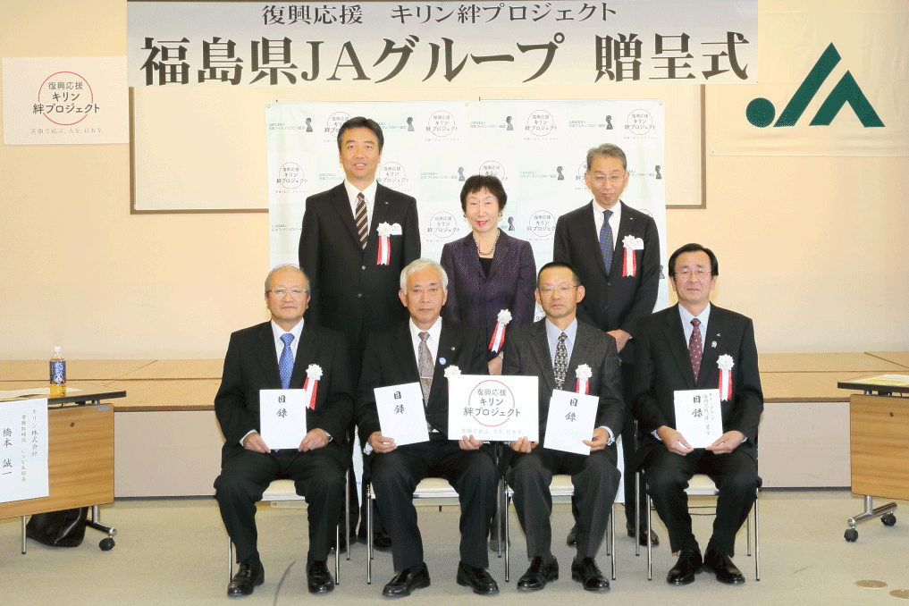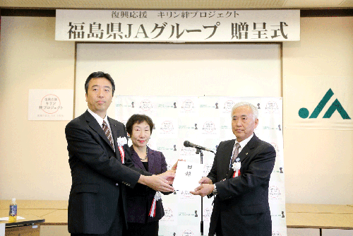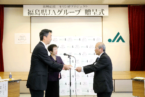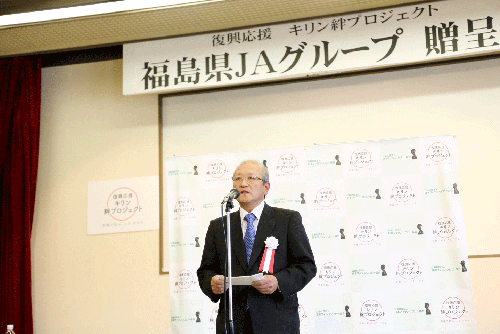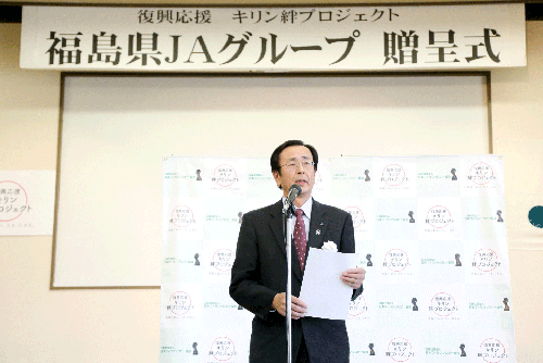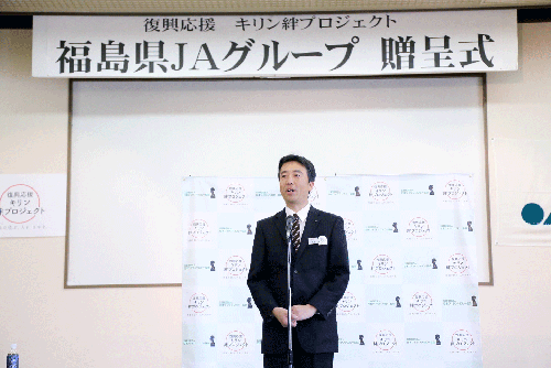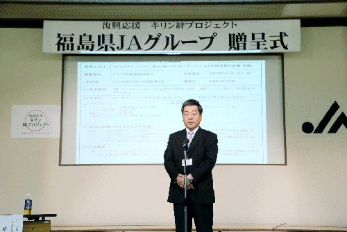 キリングループでは、震災以降、「復興応援キリン絆プロジェクト」を立ち上げ、はなはだ微力ではありますが、復興支援のために私たちができることはないかと取り組んでいるところです。ここ福島県の農業支援でも全農、JAグループ様にご協力をいただき、農業機械をお届けしてまいりました。最近では、今後のあるいは将来の農業の発展にお役に立ちたいと、地域ブランド応援体制を作ること、6次産業化を支援すること、次世代担い手の育成などにおいて、私どもなりに色々考えているところです。そのような中、今回、福島JAグループ3団体の5つの素晴らしいプロジェクトを支援させていただけることになり、大変喜んでおります。私どもの支援はささやかなものですが、このプロジェクトが成功し、また成長して将来の福島県の農業の活性化につながることを心より祈念しております。