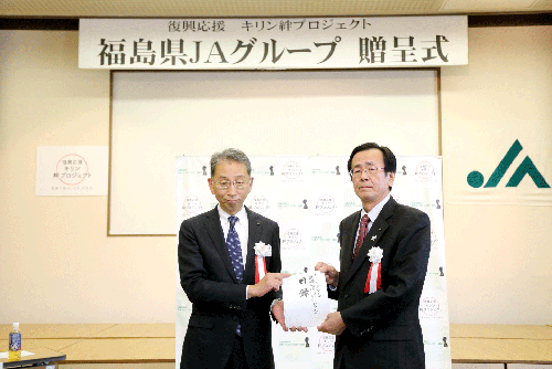 また、本日は上記の助成金とは別にキリングループ社員から集めた募金と、キリンホールディングス株式会社からの支出を合わせて、707万1,040円を福島県産果樹事業の再興、およびブランド確立支援のために 全農福島県本部様に贈呈させていただきます。