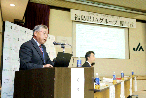 本日は、復興応援キリン絆プロジェクトということで、大変多額の支援をいただきました。昨年も復興支援をいただき、今、現場で大いに農業機械を利用させていただいております。昨年(2012年)は除染等に活用させていただいて相当の効果を上げておりますことに御礼申し上げます。