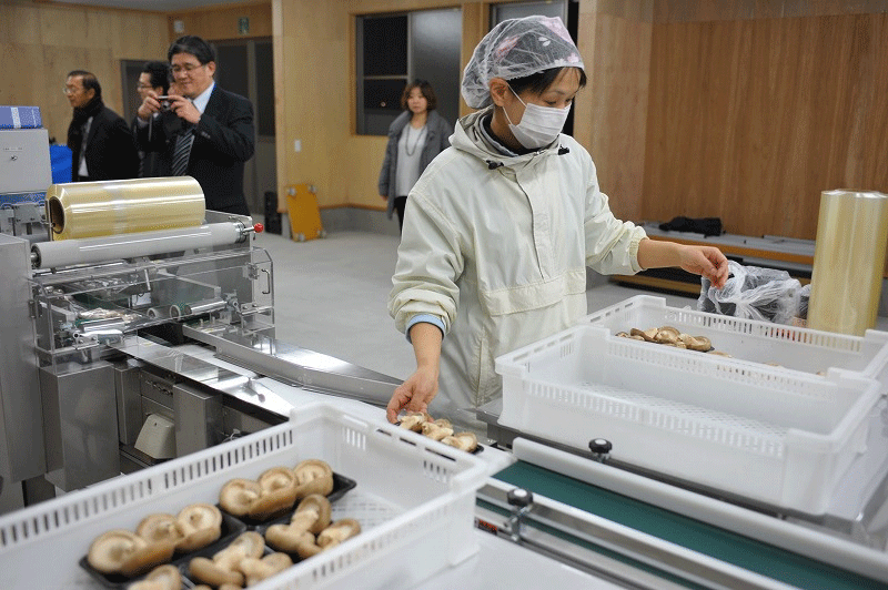 また、しいたけのパッケージ作業も見学させていただいた。職員がしいたけを手で選り分け、トレイにのせ、ラップをかけてシールを貼るという工程が、見る見るうちに進んで行く。
