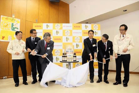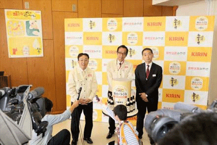本日は、あすから発売されます「キリン一番搾り 仙台づくり」初飲み会と、「復興応援 宮城の元気と笑顔」情報発信の第1弾で、女川町を紹介するコーナーとして模様替えをした工場見学者用試飲ホールのお披露目会です。