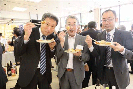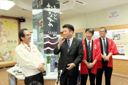 工場見学者用試飲ホール玄関には、沿岸市町の復興への取り組みと現在のまちの様子を様々に紹介する「復興応援 宮城の元気と笑顔」というブースが新設され、今回のイベントには、ブースでの紹介第一弾となる女川町から須田善明町長をはじめ、職員、地元でブランド商品開発に取り組む「復幸まちづくり女川合同会社」の皆さんも出席。復興応援 キリン絆プロジェクトが支援する、女川地域の特徴的な産品のブランド化を目指す「女川ブランディングプロジェクト」で生まれた町の新ブランド「AGAIN(あがいん)女川」の商品を紹介した。