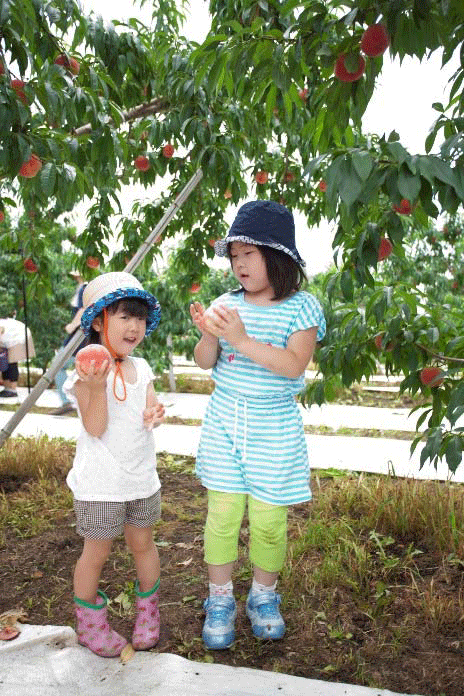 雲間からはいつしか夏の日射しが降り注ぎ、明るい緑の光があふれる果樹園には、桃のみずみずしさにも負けない、子どもたちのおいしい笑顔がたくさん咲いた。