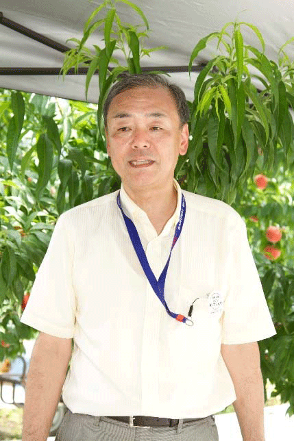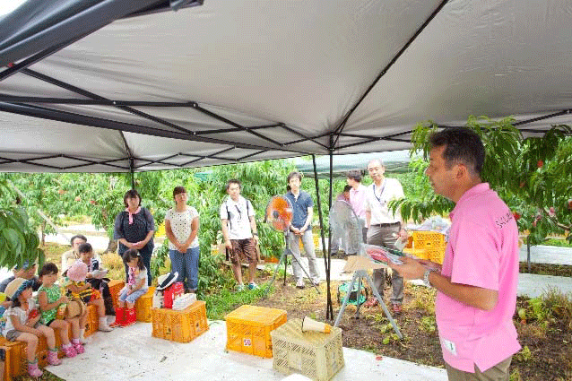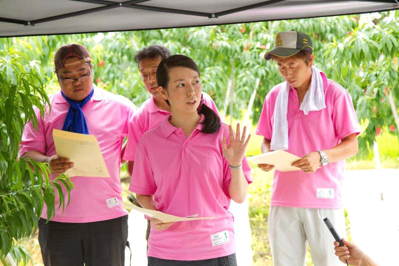 「この暑さは人間には辛いですが、桃にとってはうれしい暑さです。きょうは、ことし(2015年)4月より進めております『“桃の力”プロジェクト』の柱の一つである食育のイベント。そして、何より桃のおいしさを知ってもらおうという企画です。ことしの桃はたいへん甘く、例年より少し早めの収穫ですが、その分だけ早く、おいしい桃が食べられます。」