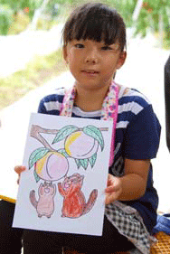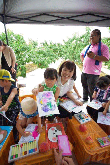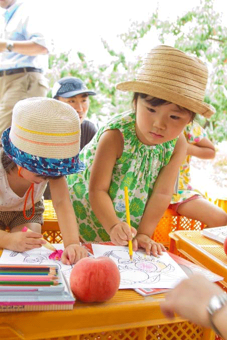 この日のイベントは「食育」の推進もテーマの一つ。現在、桃を題材に、子どもたちに向けた絵本の作成も進められている。会場には、絵本の作成を行っている名古屋市在住の絵本作家・はらきょうこ先生も出席。子どもたちと会話をしながら、リスが描かれた自作の塗り絵を一緒に楽しんだ。