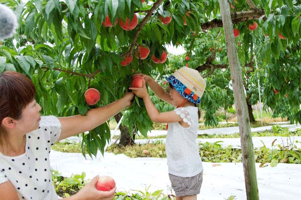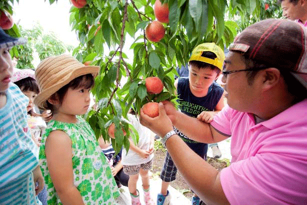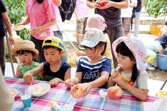 イベントには、市内の幼稚園児と保護者約20人が参加し、桃の塗り絵などを楽しんだあと、ネットワークのメンバーから手ほどきを受けながら、たわわに実った「あかつき」を枝から収穫。試食では「おいしい!」「あま~い!」という明るく元気な声が上がった。