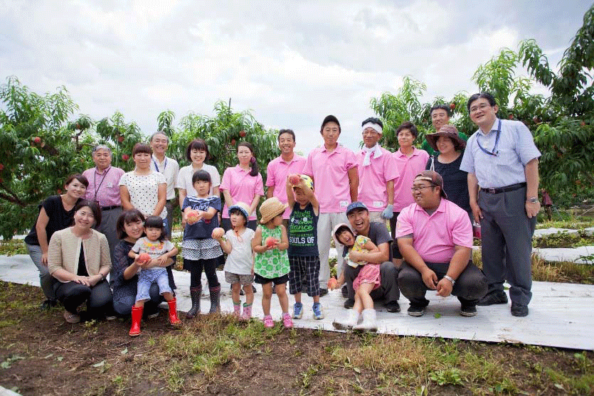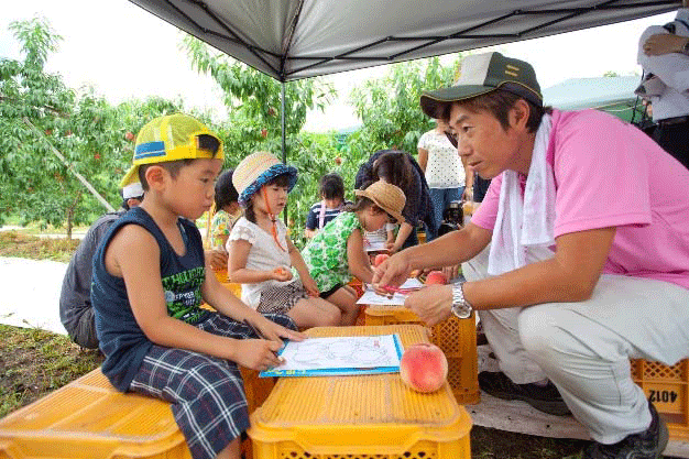 7月25日、福島市飯坂町の果樹生産者・橘内氏の果樹園で、子どもたちを招待して「収穫体験・未来の食育イベント」が開催された。