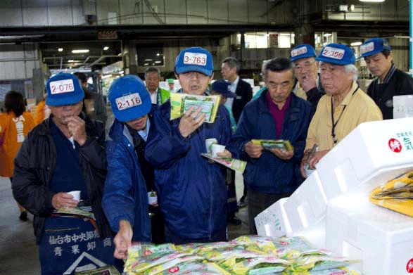 宣伝会の関係者ばかりでなく、仙台中央卸売市場で働く方々も仕事の手を休めて、茶豆が入ったカップを手に取ってその味わいを確かめた。