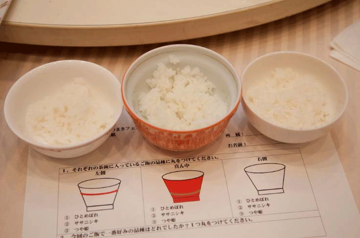 3つのお椀に盛られたご飯はただ試食するのではなく、それぞれの銘柄が伏せられ、食べ比べをして、出席者にどの銘柄かを当ててもらおうという趣向である。テーブルに用意された回答用紙にマルを付けて提出。正解者にはプレゼントが用意された。会の後半になされたクイズの正解発表では、この日出席した100名ほどの中から11名が正解した。