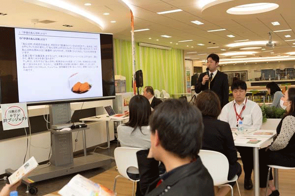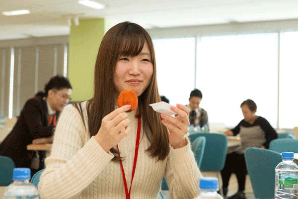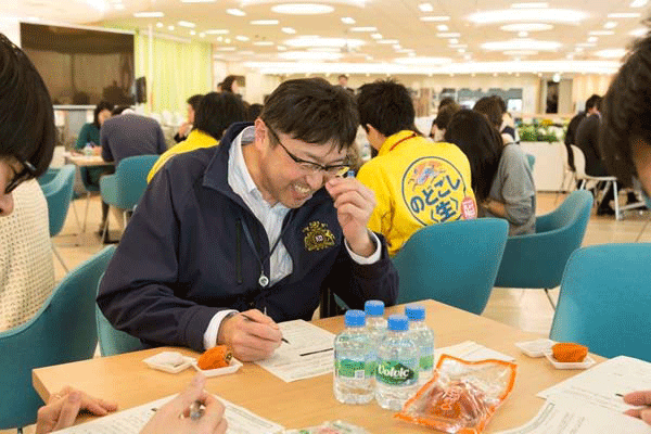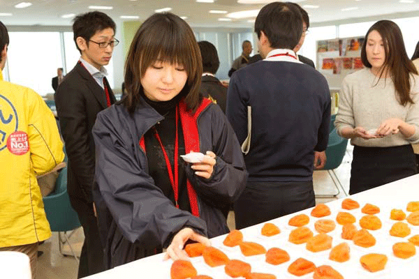 調査に協力する20代から30代の社員が会場に集まってきた。カウンターで「あんぽ柿」と「市田柿」を載せた2つの小皿を受け取り、アンケート調査票と飲料水が用意されたテーブルに着席。着席場所は自由で、同じ部署同士や親しいグループごとに席を取った。