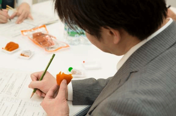 アンケートでは、生柿の好み、干し柿の好み、食べる頻度、購入意志、購入する際の価格帯、放射性物質に関する質問などが設定されていて、社員たちは2種類の柿を食べながら回答欄に記入していった。