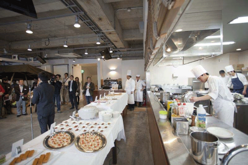 また、隣接するオープンキッチンでは、日本調理技術専門学校の先生方やスタッフが、素材の味を生かした試食料理11種類を用意。和洋中などのジャンル別、焼く・蒸す・煮込むといった調理方法によっておいしさを増した野菜を楽しむこともできたほか、訪れた料理人の方が、インスピレーションをその場で試してもらえるようにオープンキッチンを利用できたり、またスタッフに調理方法を指定して試食することもできた。