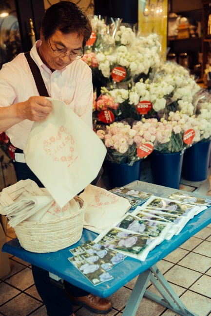 かしこまった時だけ花を買うのではなく、もっと日常に花を買っていただく。それが「モンソーフルール」のコンセプトです。自由が丘はそんな風にお花を買われる方も多い街です。きょうは雨が降り、お花を持ち帰っていただくには、あいにく不利な条件ですが、そんな街で、多くの方に南相馬のトルコギキョウを見ていただける機会を作った次第です。