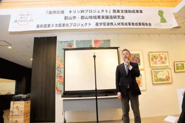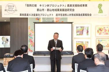 平成31年3月27日、福島県郡山市の市街地を見下ろす西郊の高台。美しい雑木林に囲まれた「ふくしま逢瀬ワイナリー」で、「復興応援キリン絆プロジェクト 果樹農業6次化プロジェクト 産学官連携人材育成事業」の成果報告会が行われた。