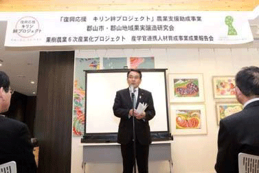 郡山市内ではこれまでほとんど栽培されていなかったワイン専用ブドウ品種を、本日ここにご出席の生産者の皆様は、ノウハウも指導者もいない中で栽培を開始しました。そんな中、キリン絆プロジェクトの支援をいただき、ワインづくりに関するコンサルタントとして実績のある「マザーバインズ」様のご指導をいただくことができました。